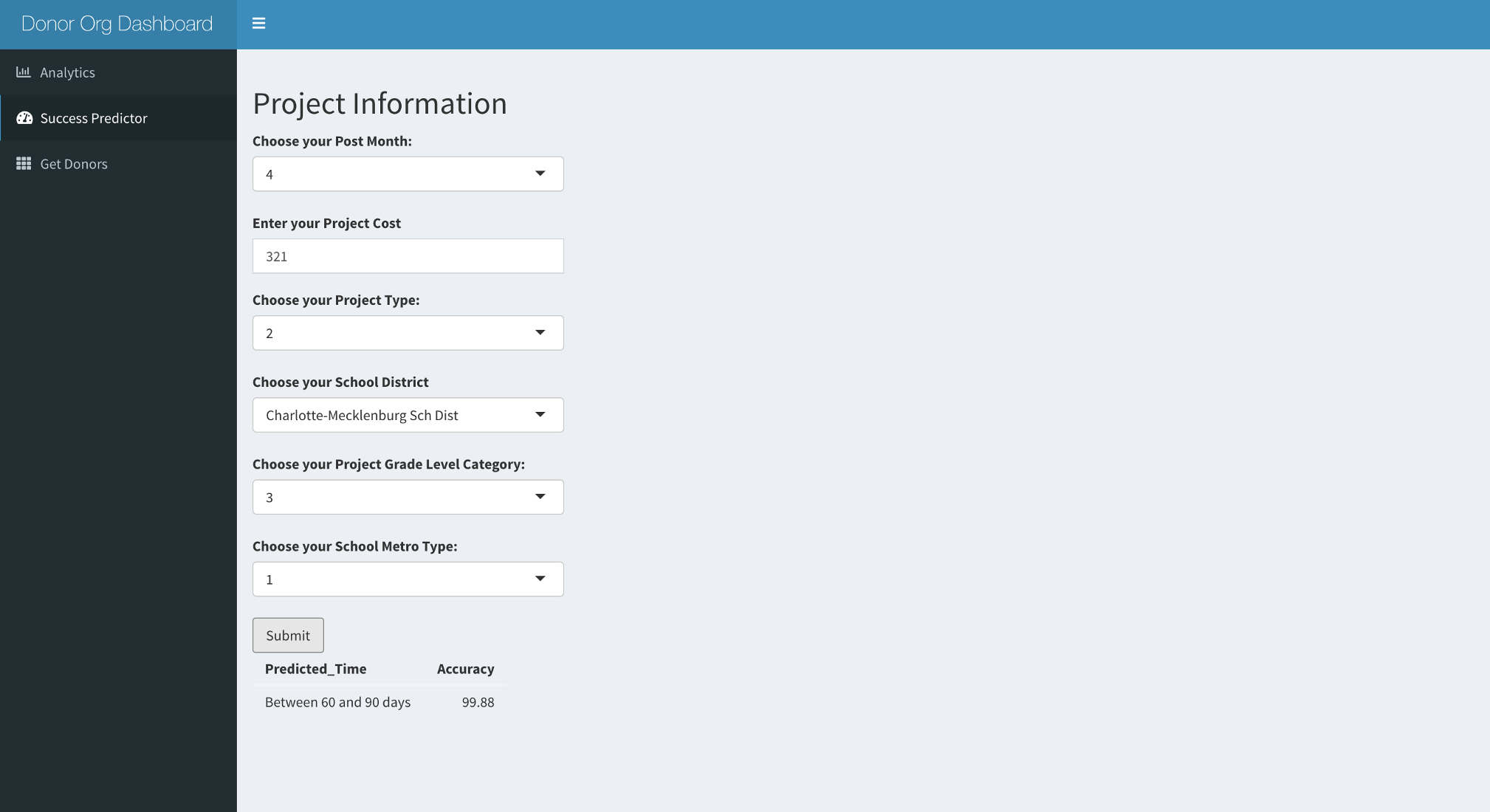In this project, I developed a classification model which would tell the number of days required to get funding for a project posted on DonorsChoose site. The teachers could use this recommendation to plan out when it would be best to post projects for funding. This was a part of coursework in my first semester.