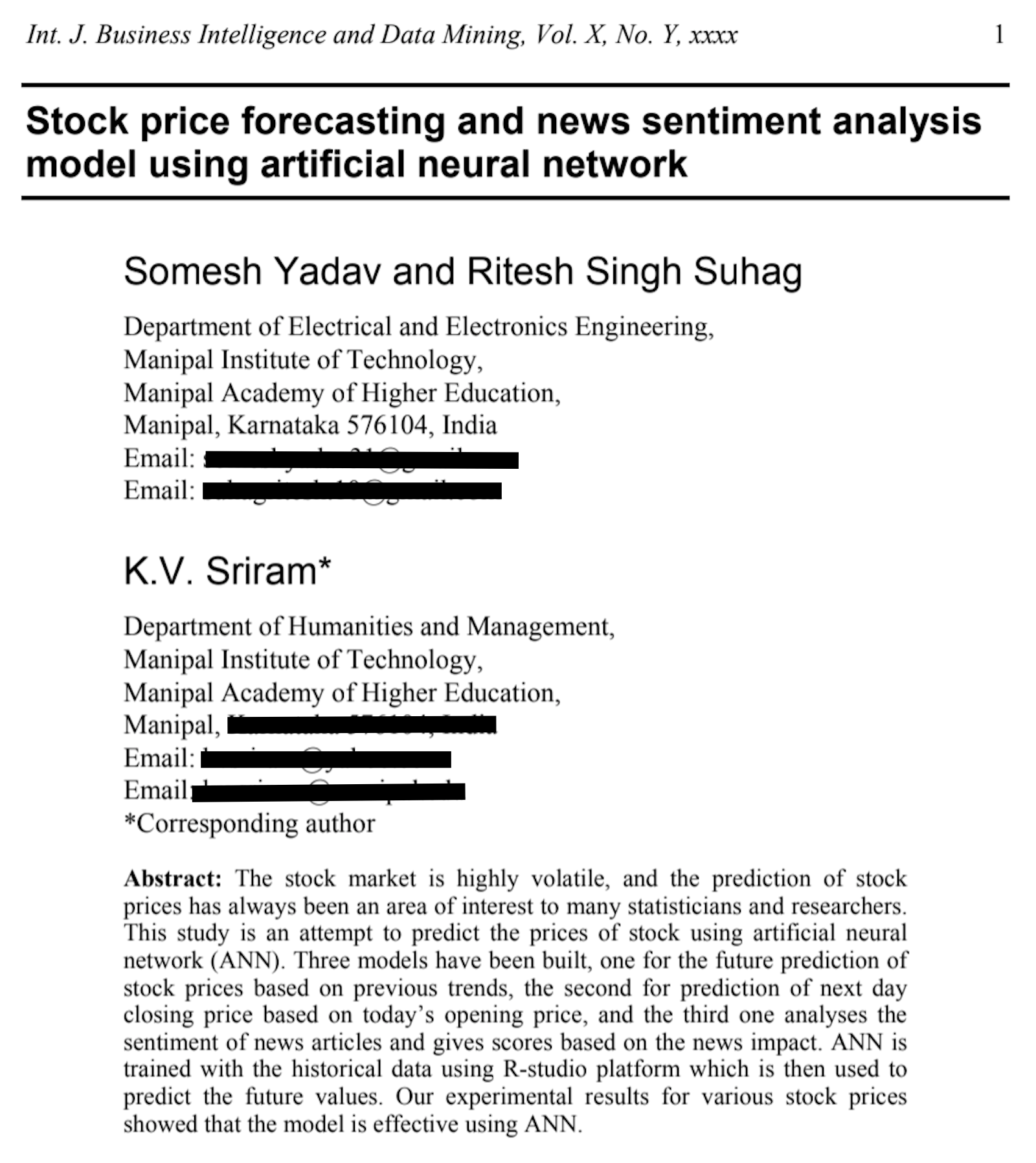 This was a research project where we tried to test the performance of Neural Networks in predicting stock prices. To increase the stock we also researched the changes when we added the news sentiment score to the model. We wrote a paper on the same which is currently under publication at 'International Journal of Business Intelligence and Systems Engineering' and can be seen using the link above. The paper is scheduled to be published in October 2021 (delayed due to the pandemic).